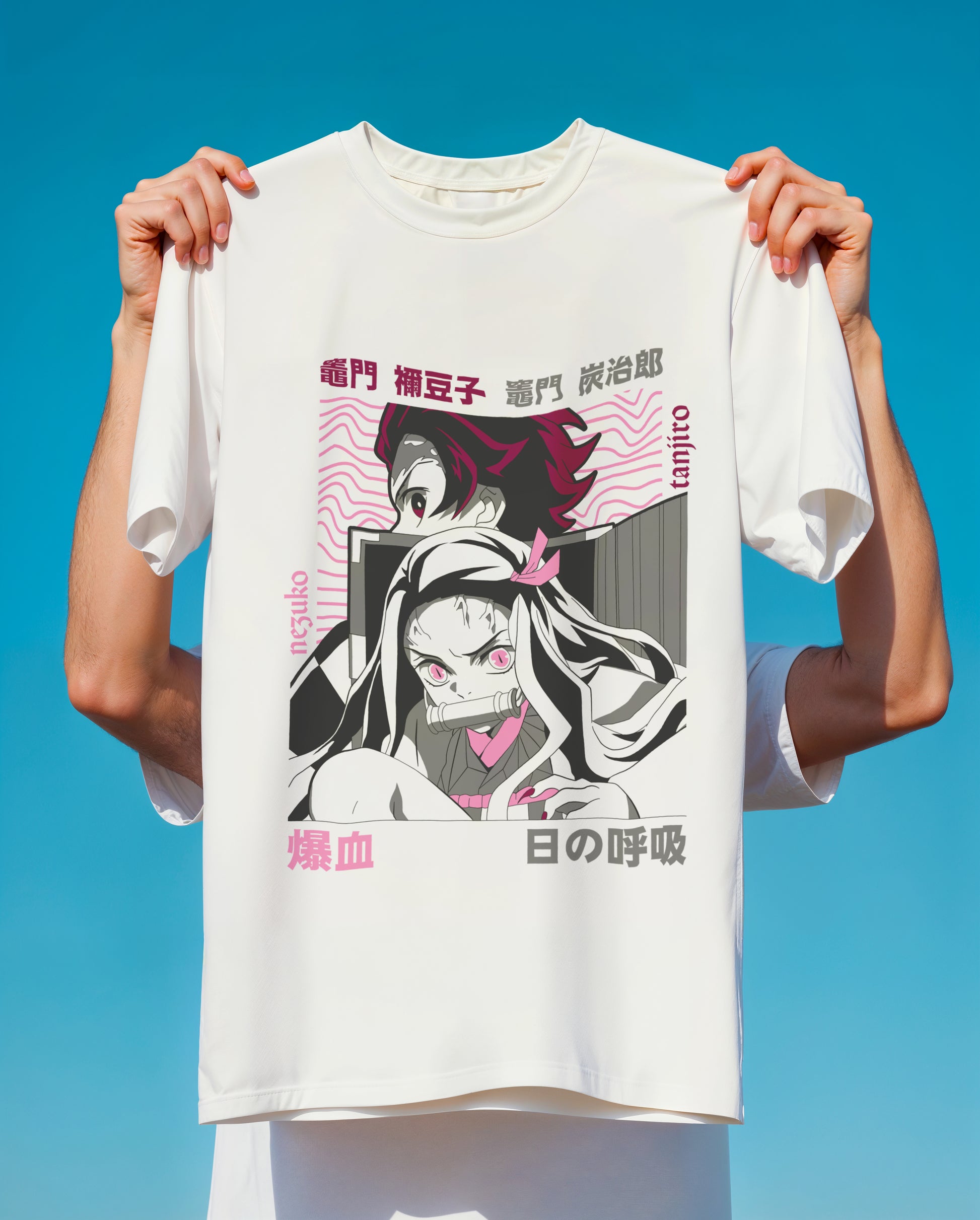 The shirt is richly detailed with Japanese text, including the characters' names: "竈門 炭治郎" (Tanjiro Kamado) and "竈門 禰豆子" (Nezuko Kamado), and clear references to their signature abilities: "日の呼吸" (Sun Breathing / Hinokami Kagura) and "爆血" (Exploding Blood). The energetic, wavy background complements the intense graphic, making this an essential piece of anime merchandise for fans of the Demon Slayer Corps.