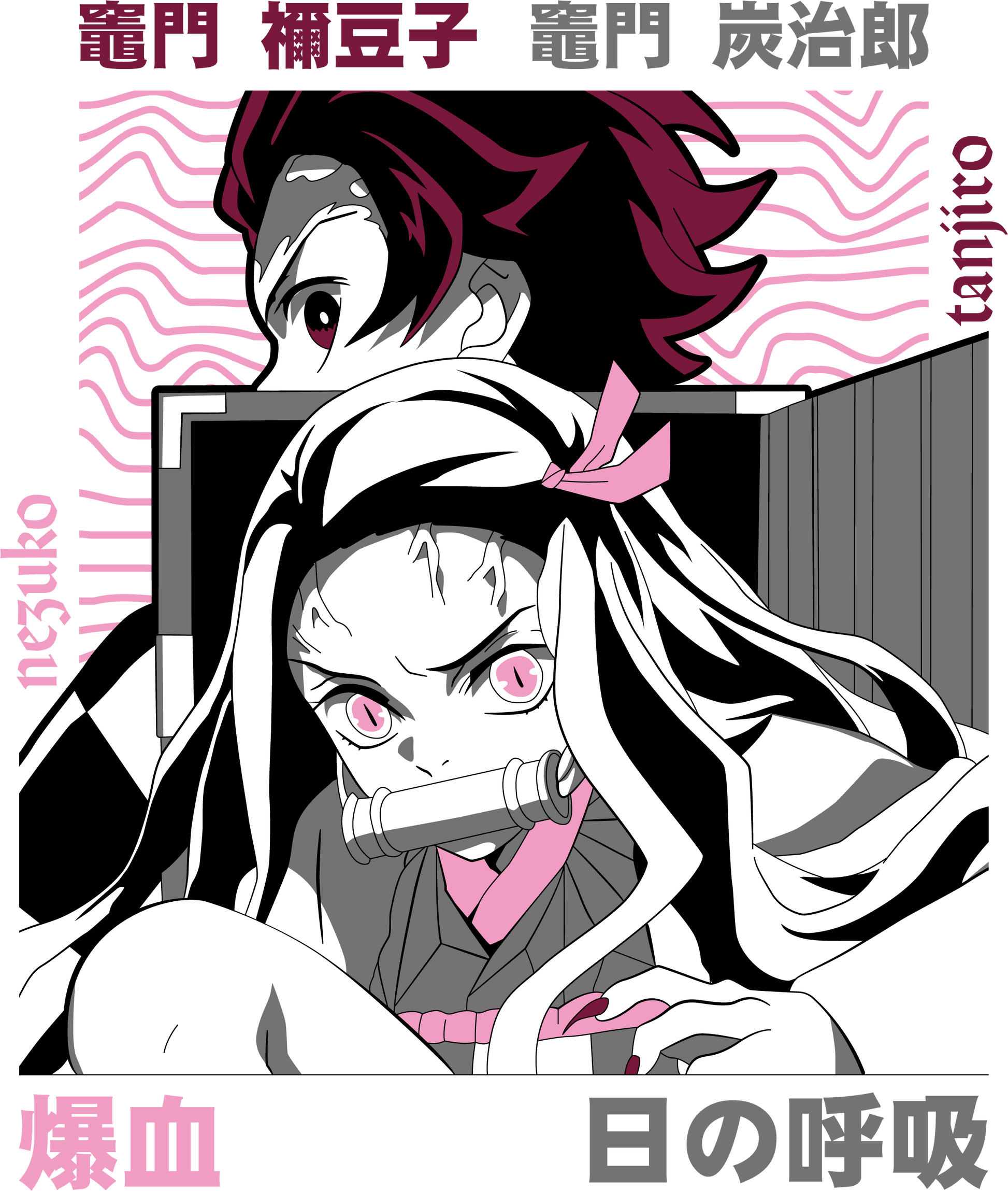 Bold graphic featuring both Tanjiro and Nezuko Kamado in a striking, high-contrast style with powerful, deep accents.