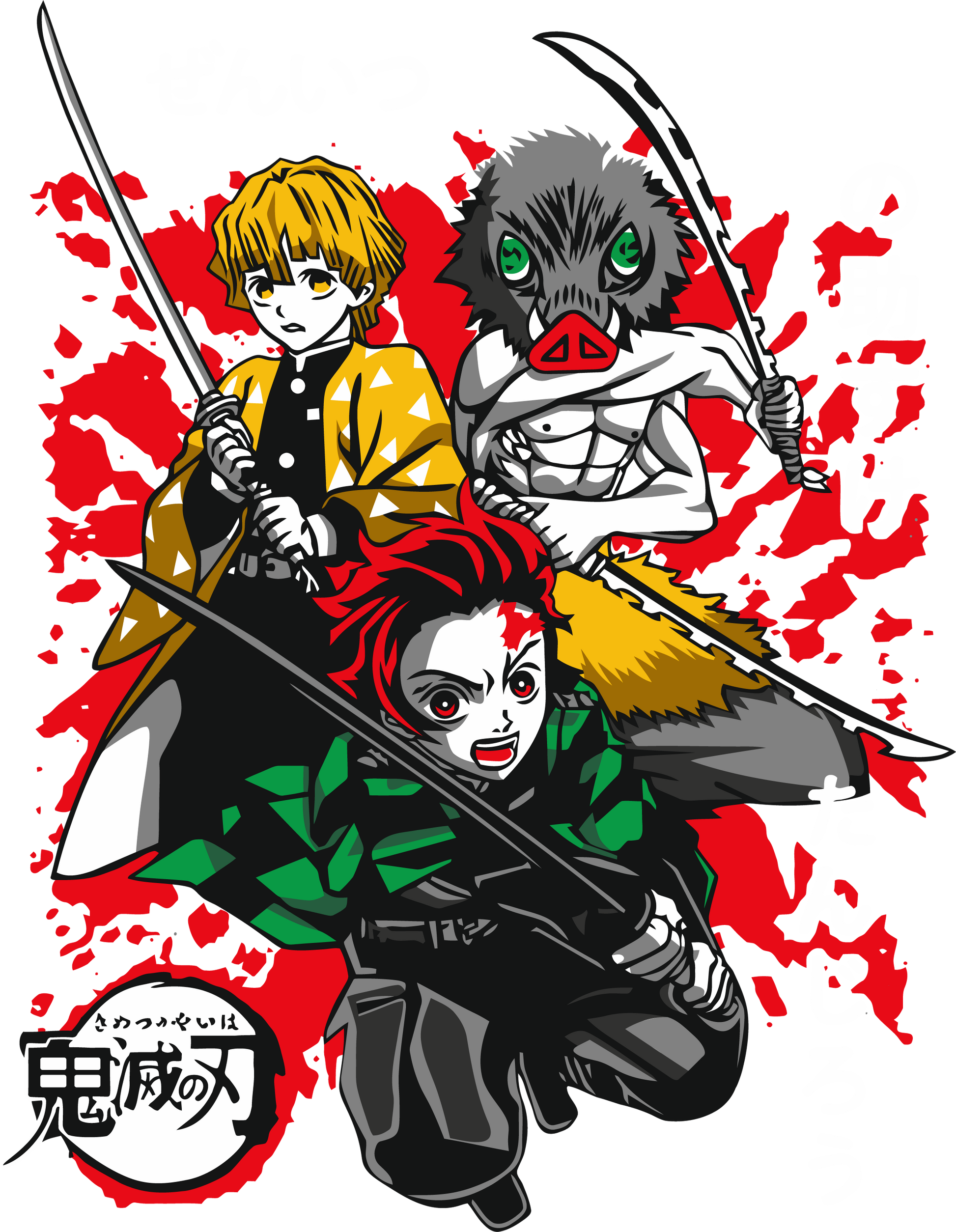 Dynamic group graphic featuring the main trio: Tanjiro Kamado, Zenitsu Agatsuma, and Inosuke Hashibira.