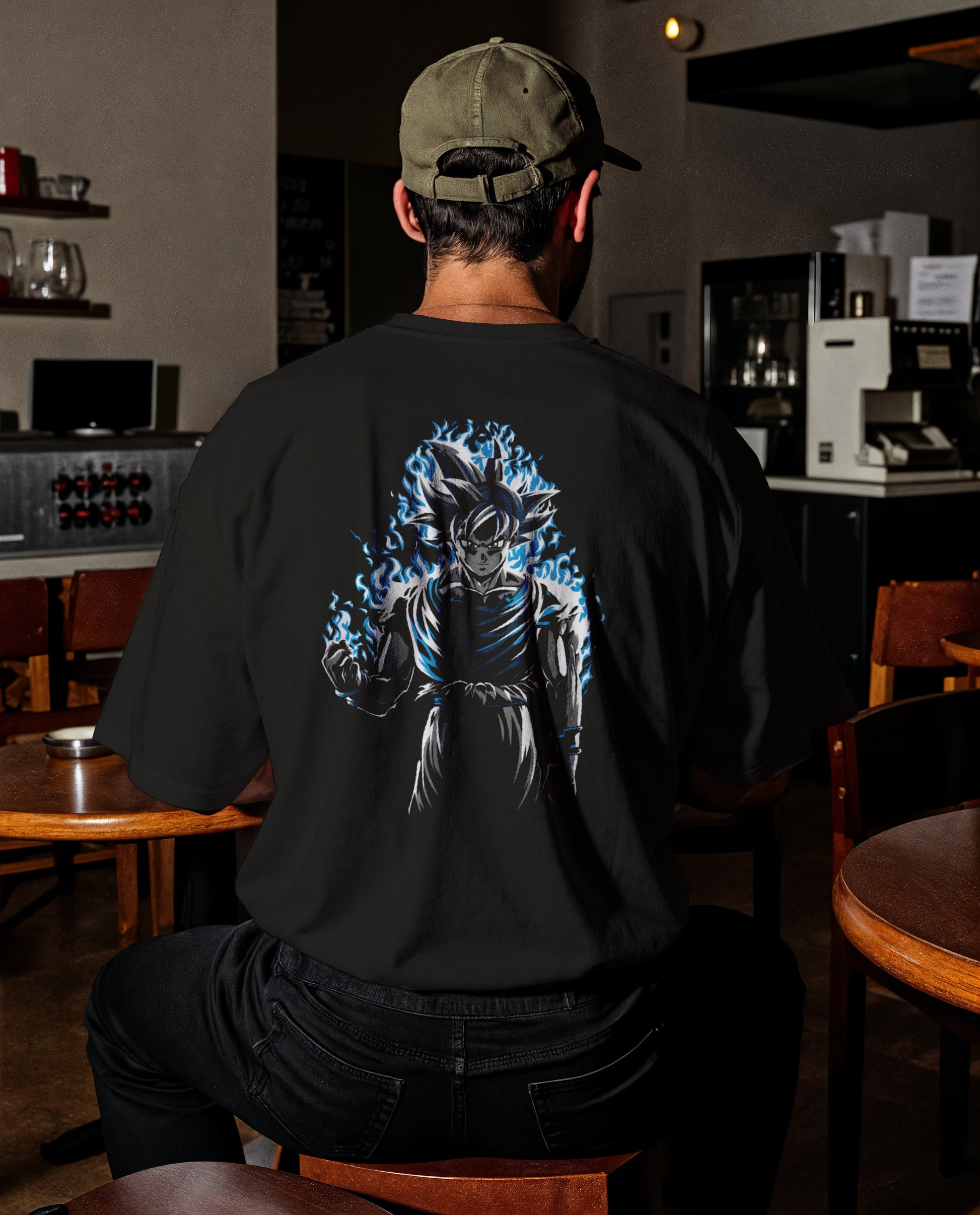 Large, dynamic back-print graphic of Ultra Instinct Goku radiating a blue aura.
