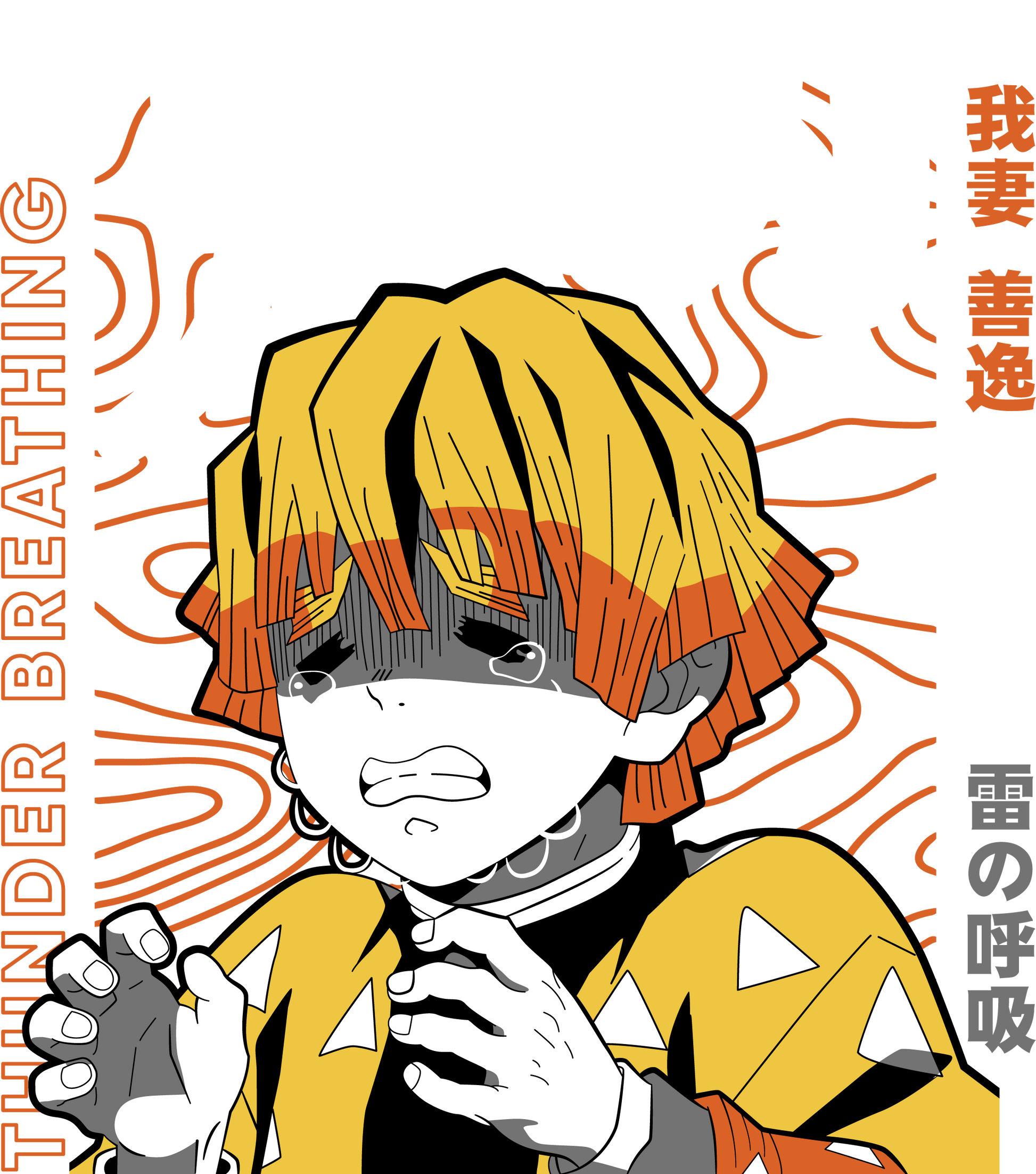 Bold graphic of Zenitsu Agatsuma in a monochromatic style with striking yellow and orange accents.
